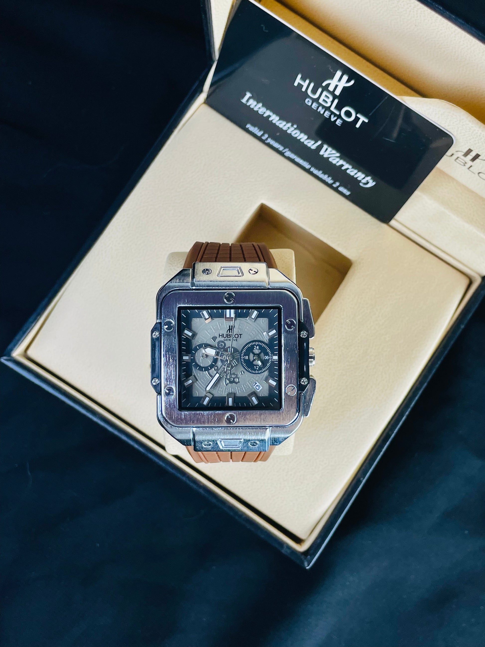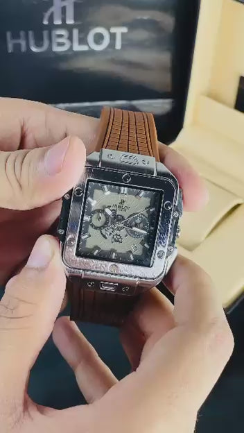 Elevate your wrist game with this bold and sophisticated Hublot Square Chronogrph dial Men's Watch, a perfect blend of modern design and precision engineering. This timepiece features a robust stainless steel case and a multi-function chronograph dial with skeleton-style details that offer a glimpse of the intricate inner mechanics.