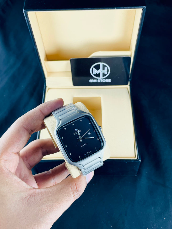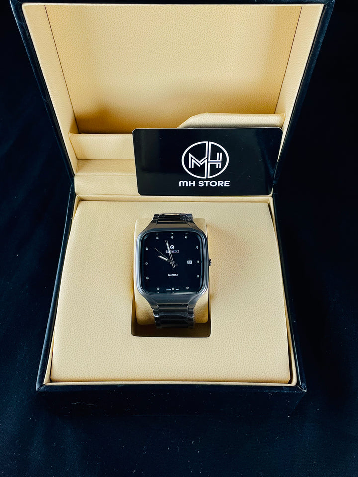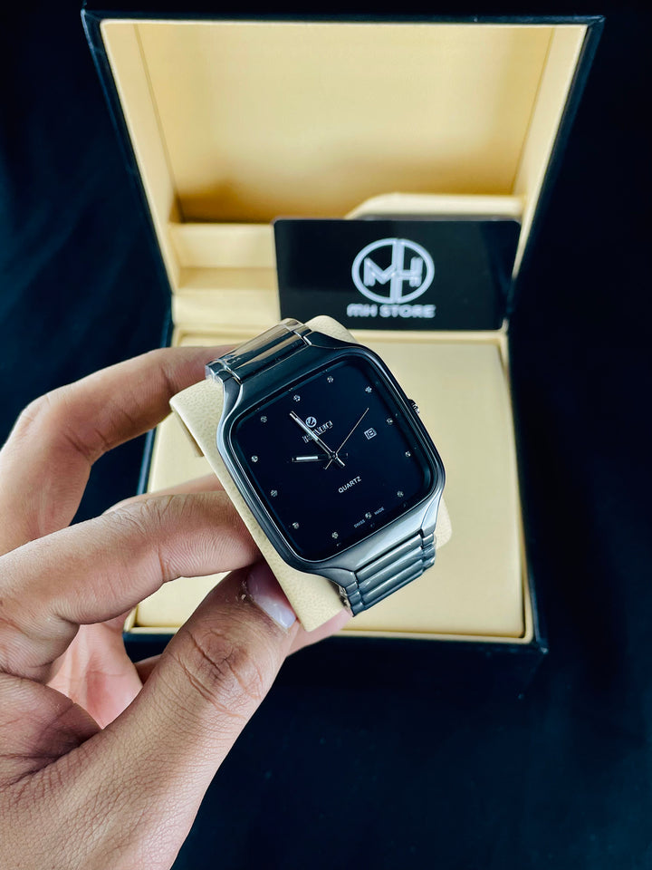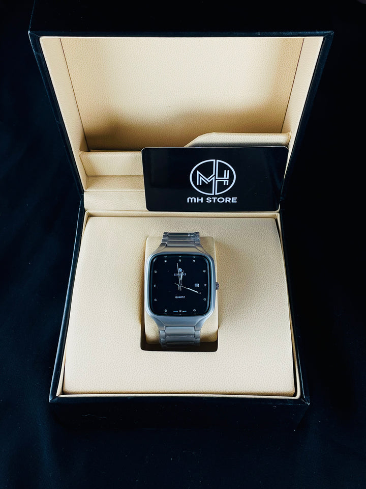 Designed with a square-shaped case and an ultra slim black dial, this collection delivers a sleek and refined look suitable for everyday wear or formal occasions. The minimalist dial, paired with a smooth steel bracelet, ensures comfort and style without compromise.